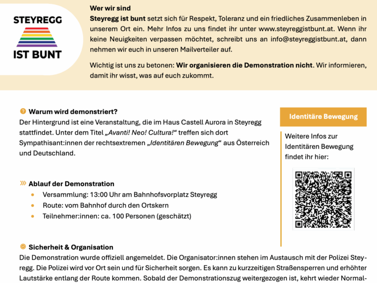 An diesem Samstag findet in Steyregg eine Versammlung als Protest gegen eine Veranstaltung der Identitären Bewegung statt. Hier gibts ein Infoblatt: Folder